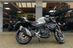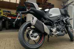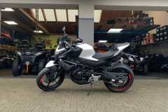 450NK jest wyposażony w przedni hamulec tarczowy Ø320 mm z radialnymi zaciskami J.Juan oraz tylny hamulec tarczowy Ø220 mm, co zapewnia precyzyjną i kontrolowaną siłę hamowania w każdej sytuacji. Standardowy system ABS dodatkowo zwiększa bezpieczeństwo. System kontroli trakcji (TCS) poprawia przyczepność i zapobiega poślizgowi tylnego koła na nawierzchniach o niskim współczynniku tarcia, zmniejszając ryzyko wypadków.