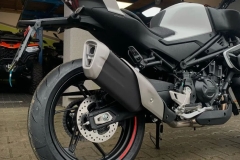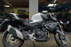 450NK jest wyposażony w przedni hamulec tarczowy Ø320 mm z radialnymi zaciskami J.Juan oraz tylny hamulec tarczowy Ø220 mm, co zapewnia precyzyjną i kontrolowaną siłę hamowania w każdej sytuacji. Standardowy system ABS dodatkowo zwiększa bezpieczeństwo. System kontroli trakcji (TCS) poprawia przyczepność i zapobiega poślizgowi tylnego koła na nawierzchniach o niskim współczynniku tarcia, zmniejszając ryzyko wypadków.